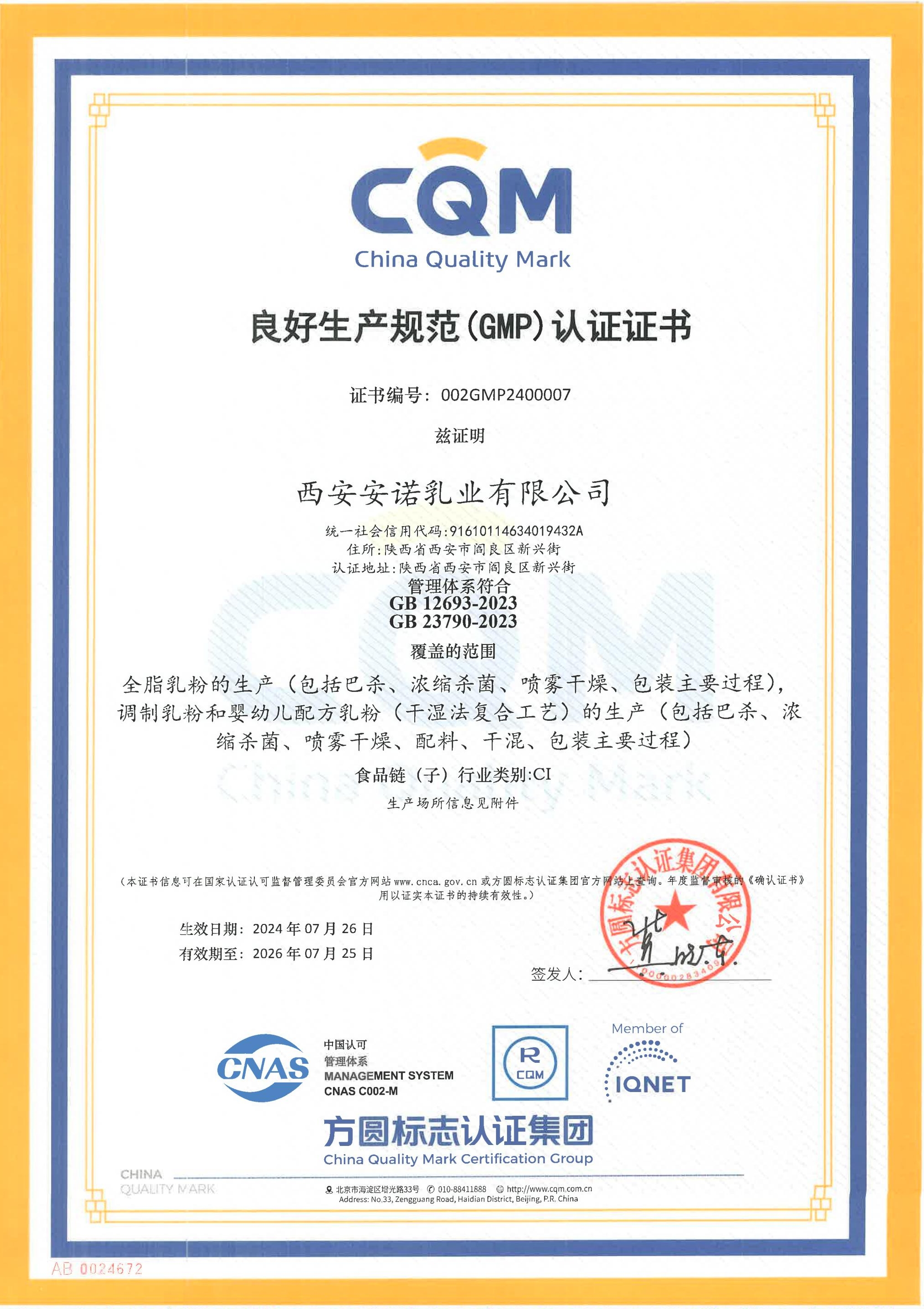 西安安諾乳業(yè)有限公司始建于1973年,迄今已有五十多年的發(fā)展歷史,安諾對(duì)于產(chǎn)品質(zhì)量有嚴(yán)控體系網(wǎng),確保每一批鮮奶、每一批原輔料、每一個(gè)過程、每一款產(chǎn)品,均按標(biāo)準(zhǔn)規(guī)范持之以恒,確保過程嚴(yán)謹(jǐn)有序,保證產(chǎn)品質(zhì)量。